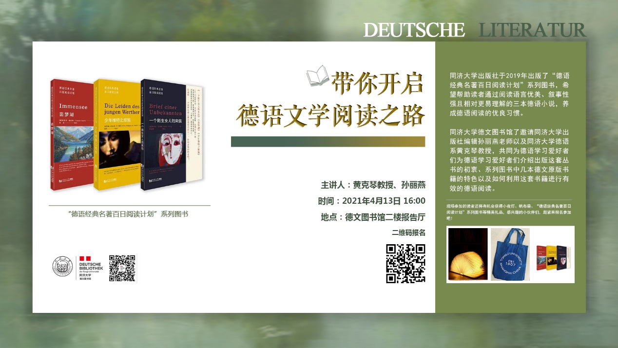 - Am Nachmittag, 13. Oktober 2020 fand im Medienraum der Deutschen Bibliothek auf dem Siping-Campus im Rahmen der Veranstaltungsreihe „100 Jahre Tongji-Universität und Deutschland“ der Vortrag — “Deutschlandbezogene Institutionen der Tongji-Universität, Schlüssel z...